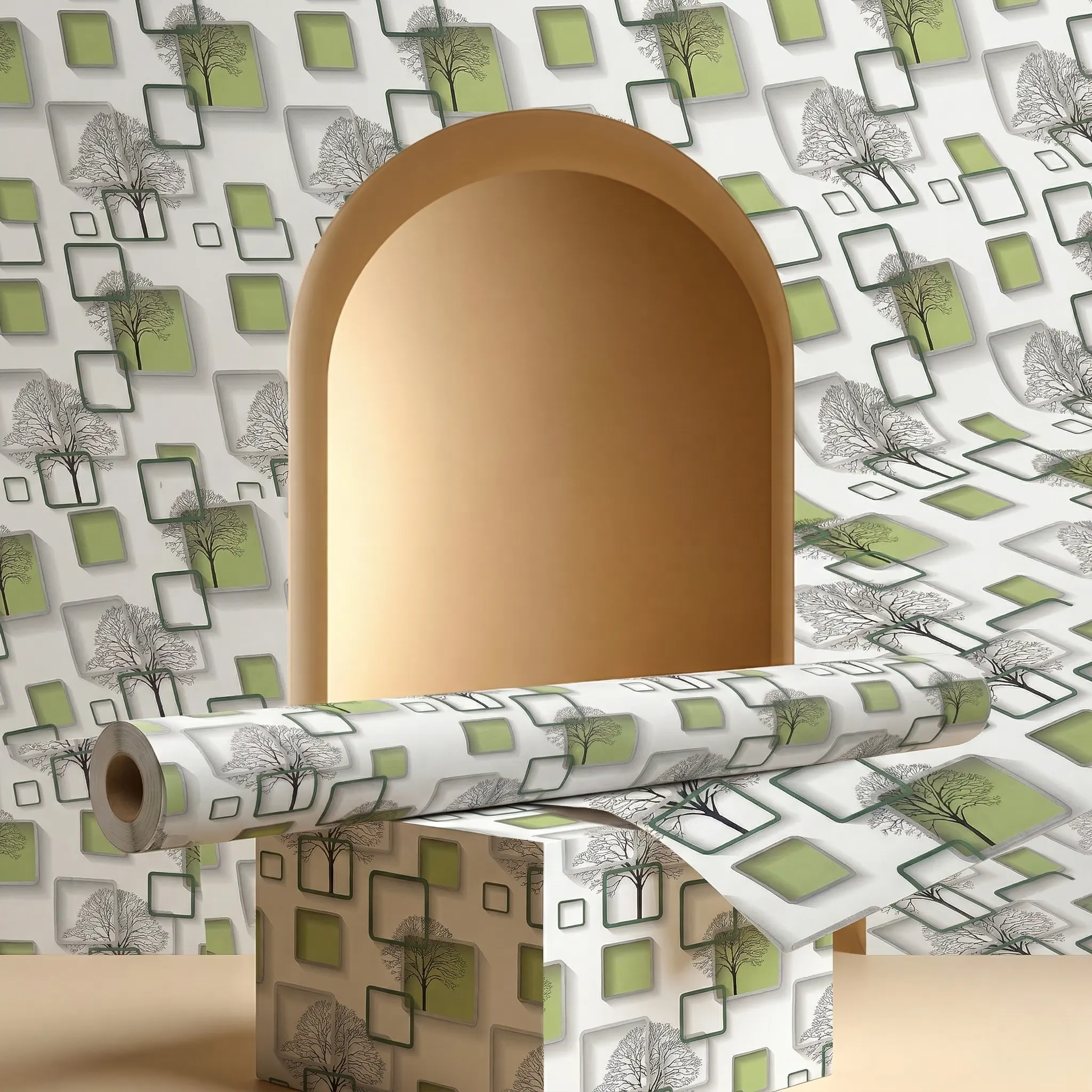 Self Adhesive Wallpaper White Green Square Texture 10 Meter